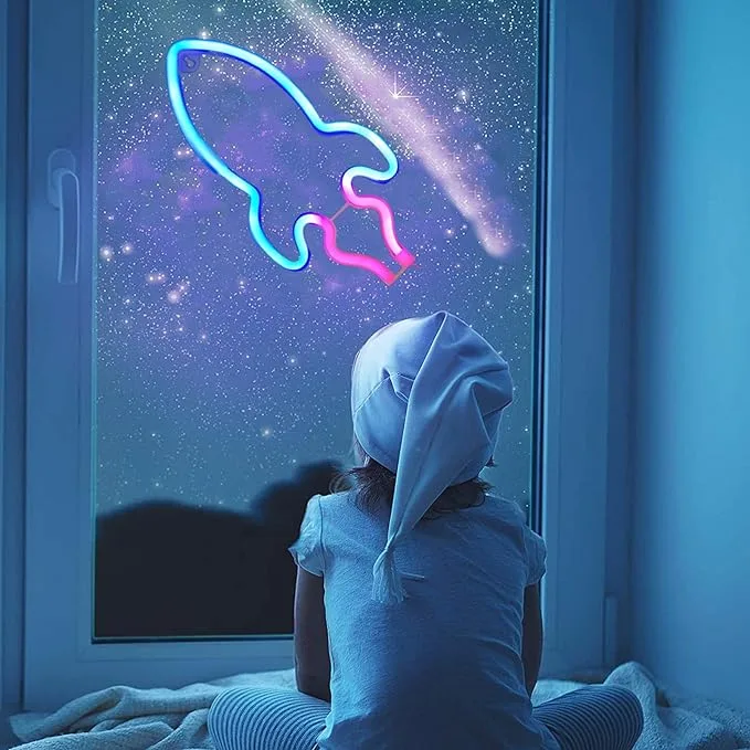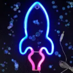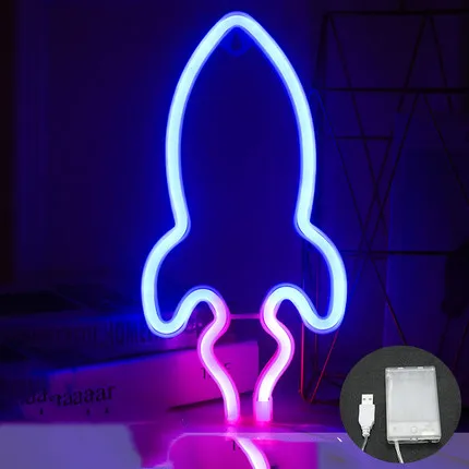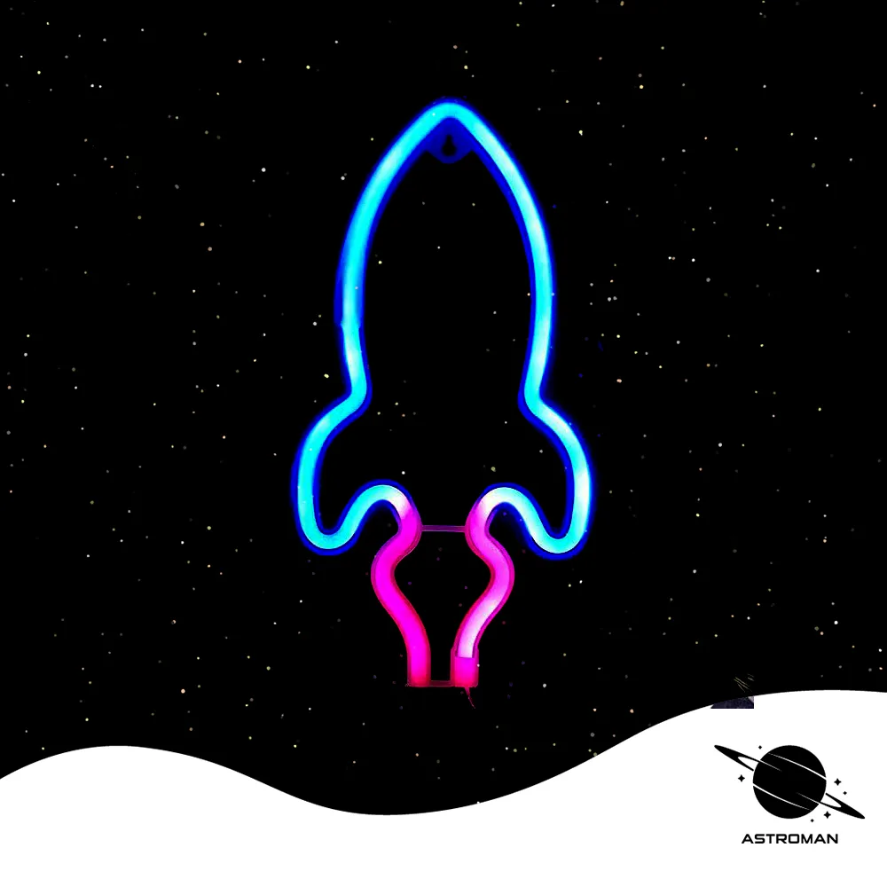 რაკეტის ფორმის ნეონ სანათი, ანათებს USB წყაროზე შეერთებით ან ელემენტებით.