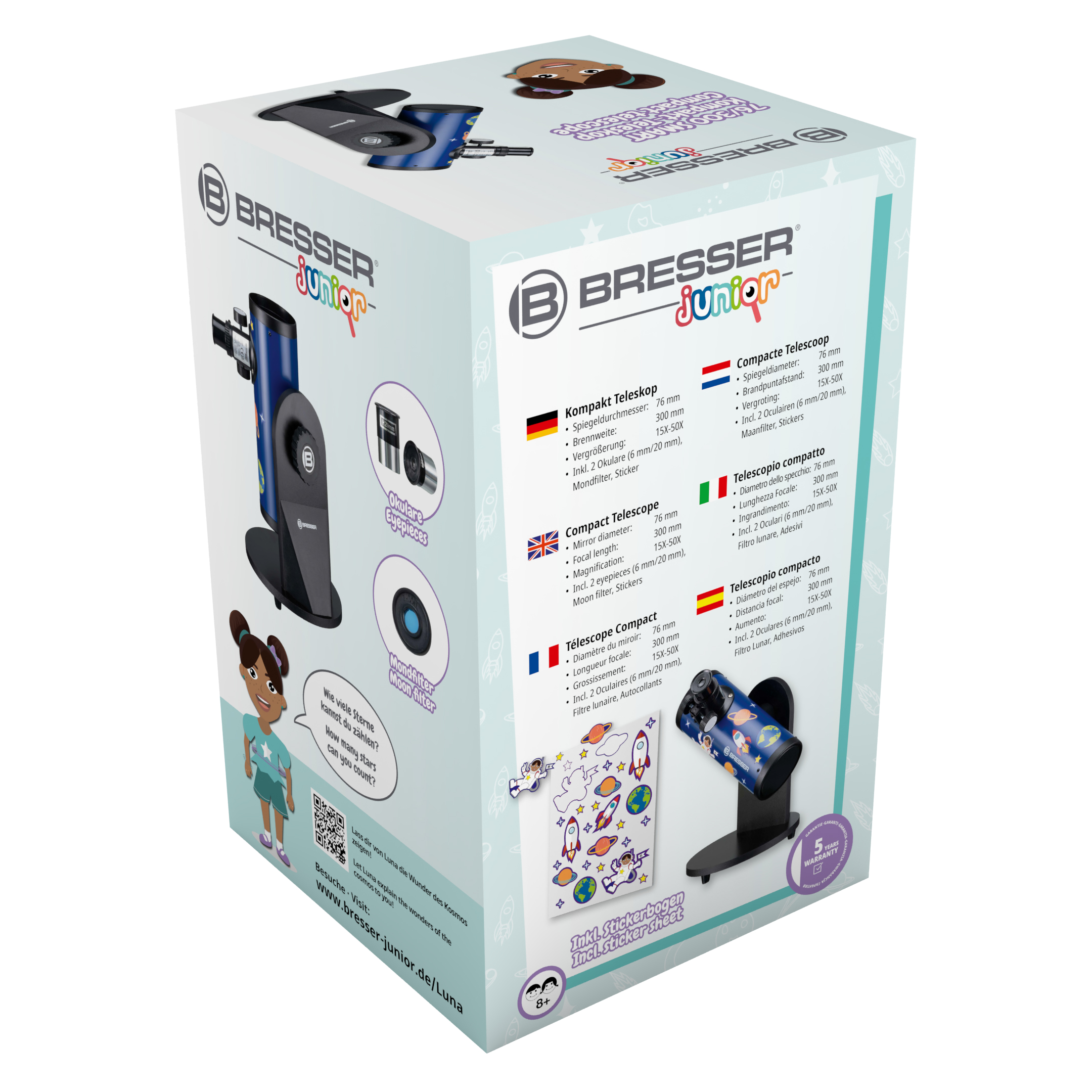 - Includes: Telescope, 2 eyepieces (6 mm/20 mm), moon filter, stickers