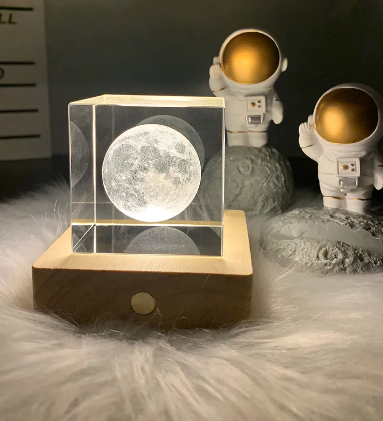 კვადრატული ფორმის, მთვარის კრისტალური ბურთი, ხის სადგამით და ნათებით