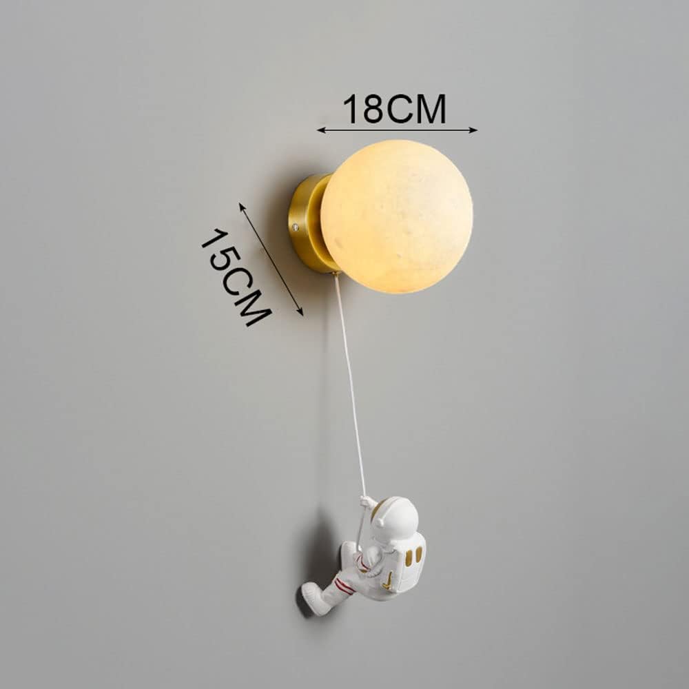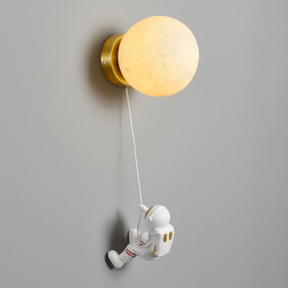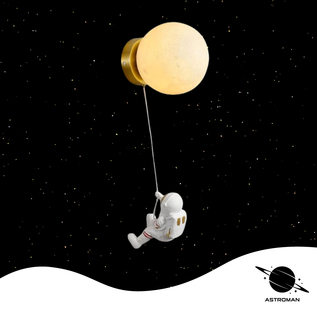 კედელზე დასამონტაჟებელი მთვარის განათება, კოსმონავტის დეკორაციით. ერთდება პირდაპირ დენის კაბელზე, მოჰყვება გარანტია 3 თვე. ზომა – 18სმ ბურთი. 15 სმ კოსმონავტი.
