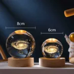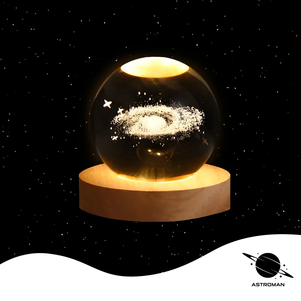 ანდრომედას ფორმის კრისტალური სანათი მრგვალი ხის სადგამით და თბილი ნათებით.