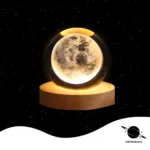 მთვარის ფორმის კრისტალური სანათი მრგვალი ხის სადგამით და თბილი ნათებით.